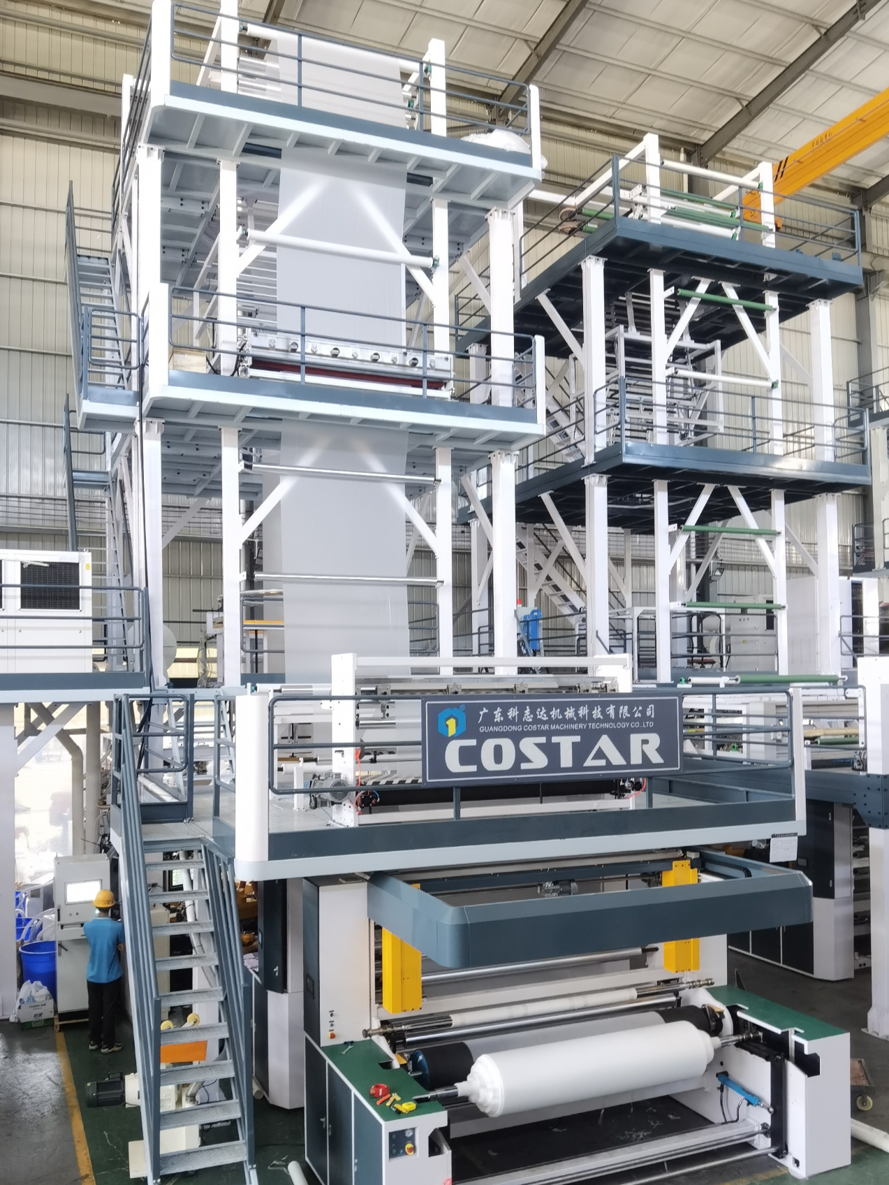 科志达新型五层共挤机组,超低能耗,整机配备自动风环和自动称重配料系统,适用于生产亚光 PE 膜、炸药膜、盐膜、热收缩膜等